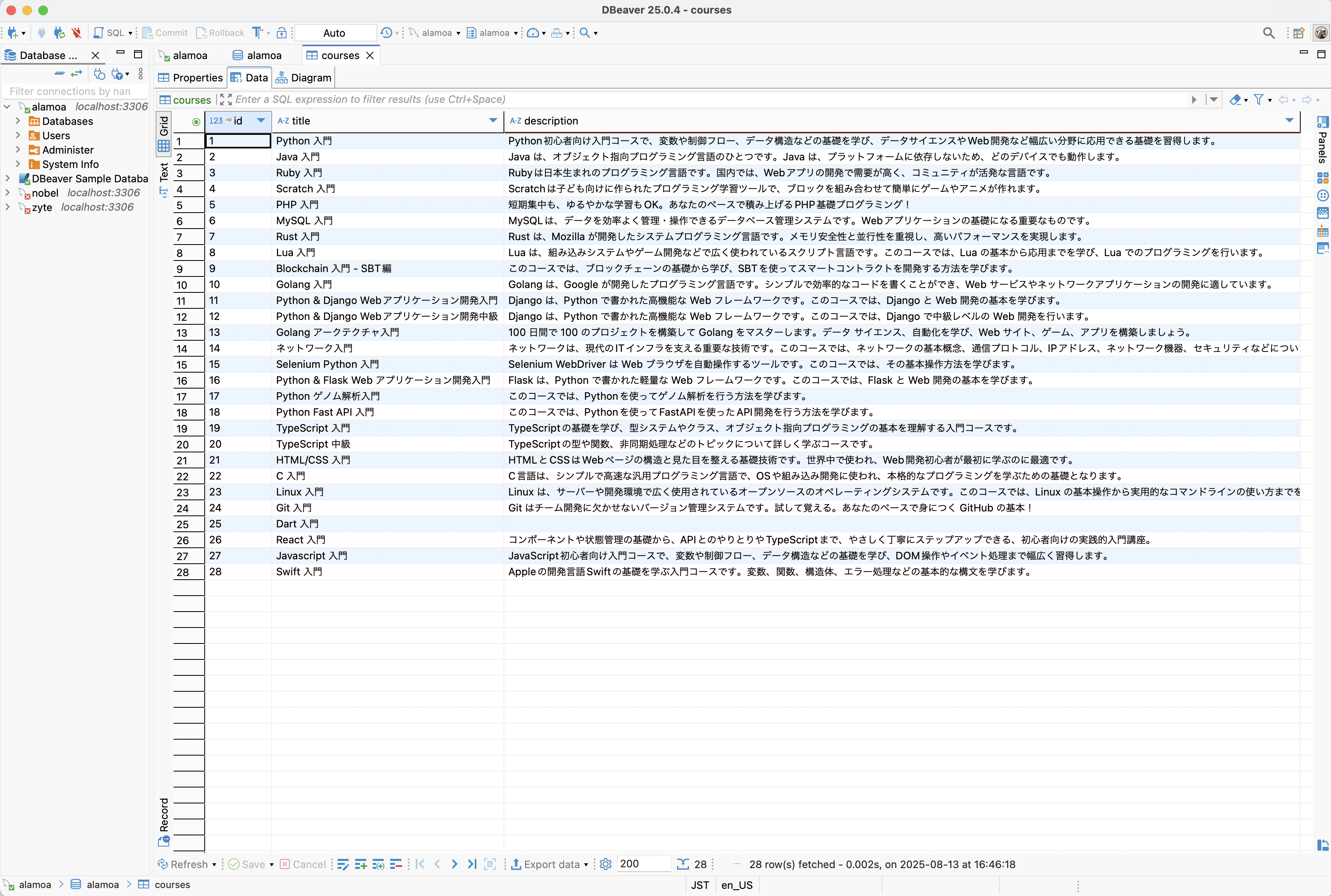 後半では演習として、Selenium を使った スクレイピング にも取り組みます。 Alamoa のコース紹介ページからコースタイトルと説明文を取得し、そのデータを MySQL に保存する小規模なデータベースを構築します。 どの順番で処理をしていくか、というロジックデザインから考えていく、実践的なプログラムの書き方を紹介します。